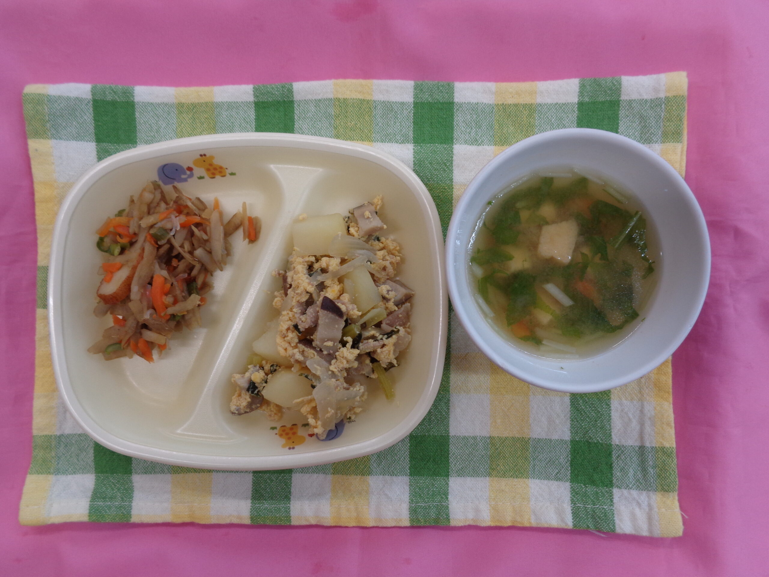 今日の主菜は≪豚肉の卵とじ≫です。たんぱく質は、多数のアミノ酸で構成されています。卵は、体に必要な栄養素のほとんどを含有し、食事から摂らなければいけない必須アミノ酸のバランスがよい優秀な食品。一方の豚肉は、たんぱく質だけではなく体の組織づくりに役立つ必須アミノ酸などが含まれています。